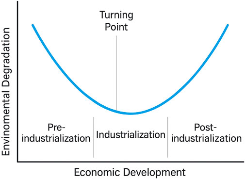 In addition, during the industrialization period, the level of economic activity is significantly high, with industrial production reaching its peak. As a result, environmental degradation intensifies. This stage typically occurs before the turning point on the EKC (Cherniwchan, 2012). The final phase, known as post-industrialization, is considered a stage of structural transformation in which economic activity shifts from the industrial sector to the technology-intensive and service-oriented sectors (Shao et al., 2023). During this stage, governments tend to place greater emphasis on achieving a cleaner environment through sustainable policies and green innovation. This is the stage at which the EKC reaches its turning point, indicating a shift from increasing to decreasing environmental degradation as the income continues to increase.