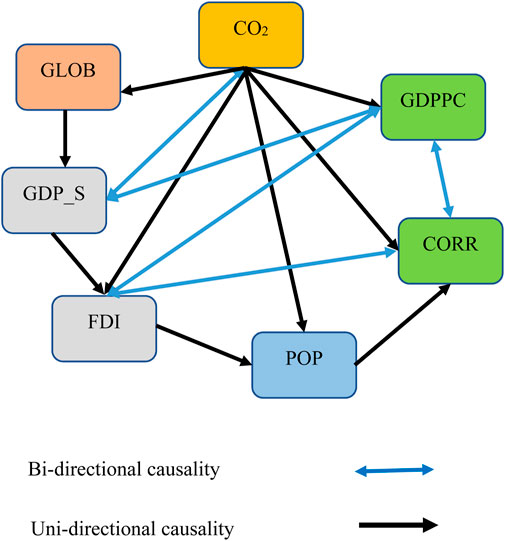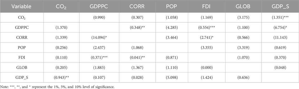 The results of the pairwise Granger causality test, presented in Table 8 and illustrated in Figure 2, reveal several important relationships. A bi-directional causality is observed between CO2 emissions and GDP per capita squared (GDPPC_Square), GDP per capita (GDPPC) and GDPPC_Square, GDPPC and corruption (CORR), and foreign direct investment (FDI) and CORR. Additionally, a unidirectional causality runs from CO2 emissions to globalization (GLOB), GDPPC, CORR, population (POP), and FDI.