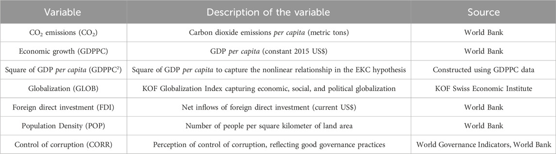 This research investigates the EKC hypothesis in Uzbekistan using quarterly data spanning from 1996 Q3 to 2022 Q4. The secondary data include CO2 emissions (metric tons per capita), GDP per capita (constant 2015 US$), square of GDP per capita, globalization (KOF index), foreign direct investment (net inflows BoP, current US$), population density (people per sq. km of land area), and control of corruption (estimate) data collected from the World Bank and KOF Swiss Economic Institute. Given Uzbekistan’s economic structure and its limited representation in the existing EKC literature, this research provides new insights into understanding the EKC in transition economies. Table 1 shows the definition of the variables and the sources of the data.