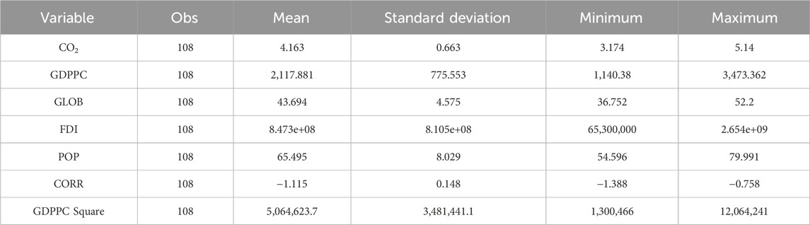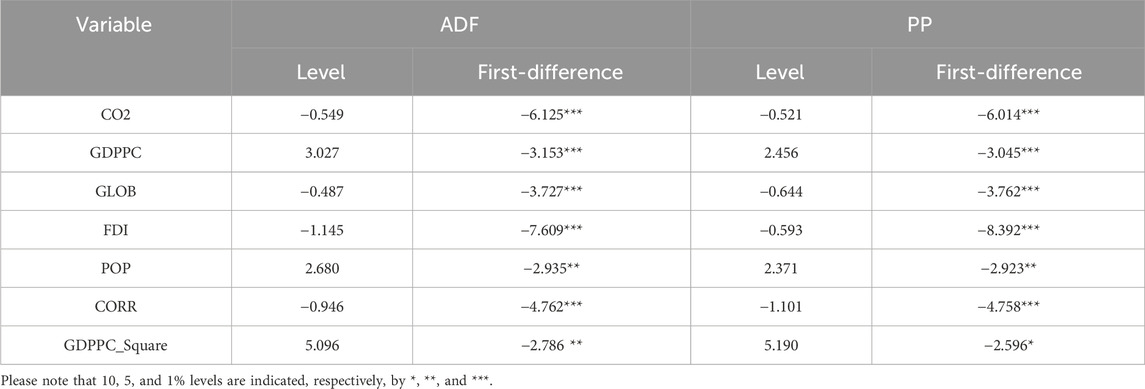 Before examining the applicability of the EKC hypothesis in Uzbekistan, we checked the descriptive statistics of the dataset, correlation matrix, stationarity tests, and lag selection and diagnostics. This section also uses the time-series economic technique, VAR model, for this analysis. Table 2 summarizes the descriptive statistics; the mean values of CO2, GDPPC, GLOB, FDI, POP, CORR, and GDPPC square are 4.163; 2,117.881; 43.694; 8,473.0; 65.495; −1.115; and 5,064,623.7, respectively. Meanwhile, the standard deviations of CO2, GDPPC, GLOB, FDI, POP, CORR, and GDPPC square are 0.663; 775.553; 4.575; 8,105.0; 8.029; 0.148; and 3,481,441.1, respectively. On one hand, the mean and standard deviation values of foreign direct investment and GDP per capita square are significantly higher than the results of other variables. On the other hand, the control of the corruption rate has both the lowest mean and standard deviation value.