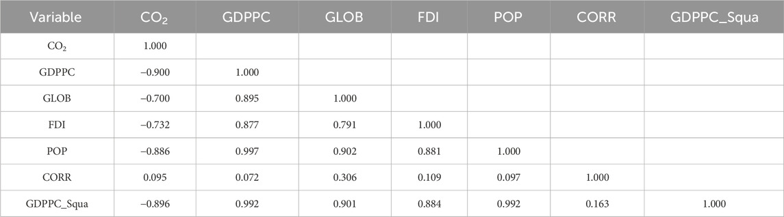 Table 3 reveals the correlation analysis of the presented variables. According to the results, there are strong negative correlations between CO2 emissions, GDP per capita, square of GDP per capita, population, foreign direct investment, and globalization, and the results are −0.900, −0.896, −0.886, −0.732, and −0.700, respectively. These findings suggest that as the values of these negatively correlated variables rise, CO2 emissions tend to decline. Only the control of the corruption rate has a slightly positive correlation result of 0.095, suggesting that this variable is not significantly associated with CO2 emissions.