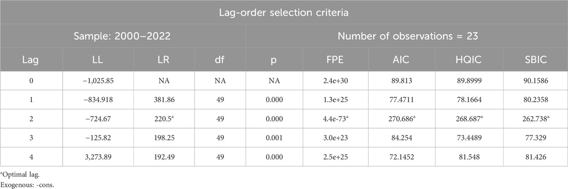 Table 5 indicates the lag length selection criteria to determine the correct number of lags for the VAR model. Usually, there are four common criteria for the lag length selection process, namely, FPE, AIC, HQIC, and SBIC. We have selected these four criteria to identify the optimal number of lags.