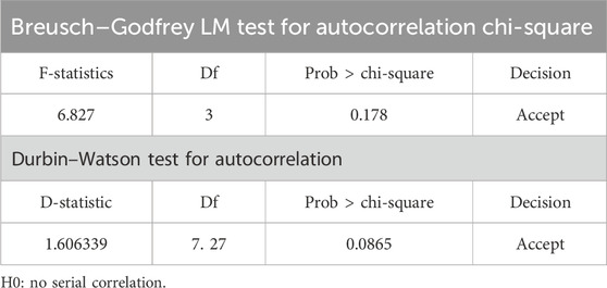 Table 6 shows the results of the Breusch–Godfrey LM test for serial correlation and the Durbin–Watson test for autocorrelation. The results of the LM test indicate a chi-square statistic of 6.827 with a p-value of 0.178, which is greater than the 5% significant level, and this suggests that there is no evidence of serial correlation. However, the test statistics of the Durbin–Watson autocorrelation range from 0 to 4. The value of this test is 1.606339, indicating a weak positive autocorrelation as the result falls between 0 and 2.
