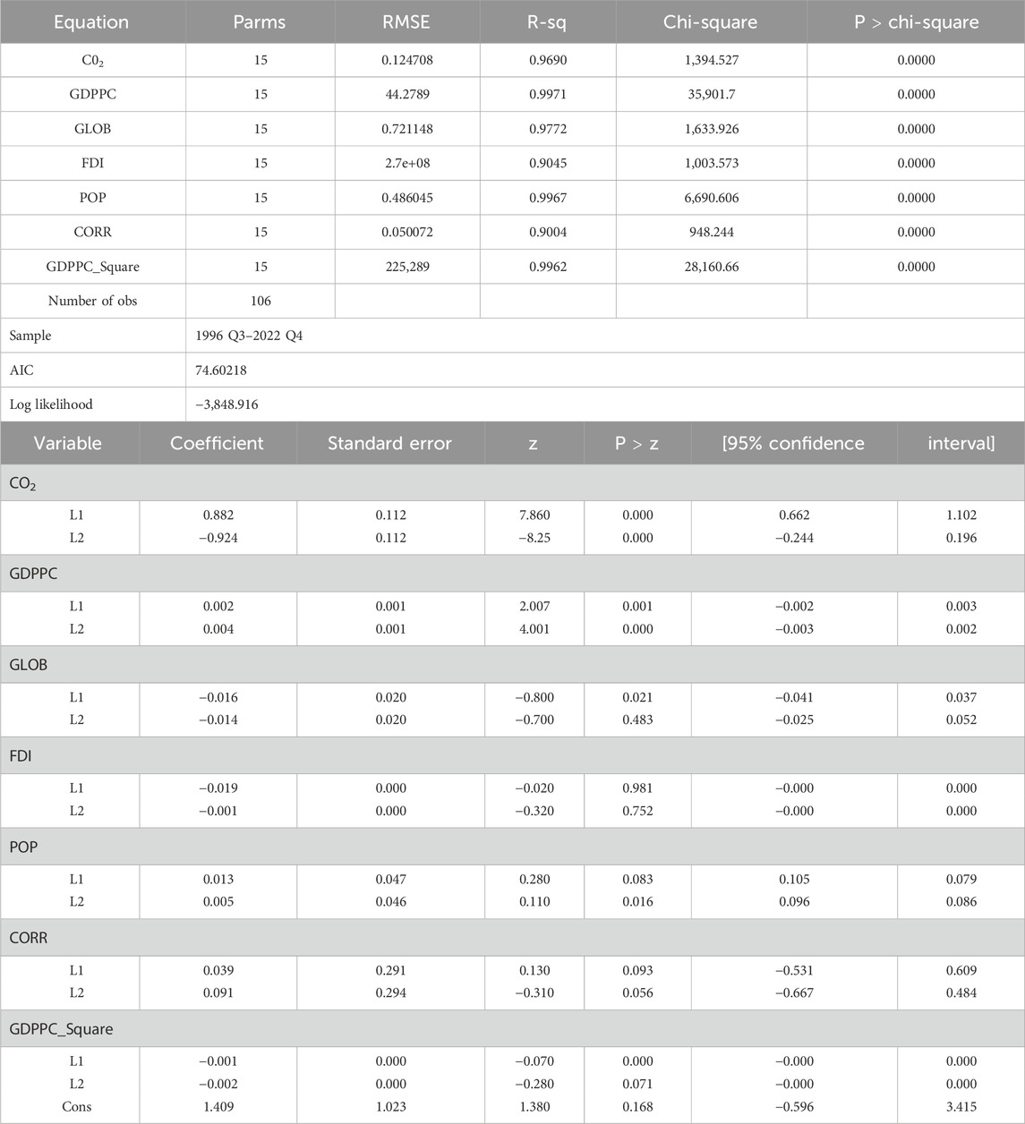 Table 7 presents VAR results, with CO2 emissions as the dependent variable. This test is important for gaining significant insights and exploring the dynamic interrelationships between time-series variables. The results indicate that GDP per capita and its squared term are statistically significant, with GDP per capita exerting a positive effect and the squared term exerting a negative effect on CO2 emissions. This supports the existence of an inverted U-shaped relationship, providing empirical evidence for the EKC hypothesis in the short run. Additionally, globalization and FDI are both statistically significant and negatively associated with environmental degradation. This suggests that these variables play a stabilizing role, reflecting their persistent influence in shaping economic dynamics and contributing to long-term environmental improvement.