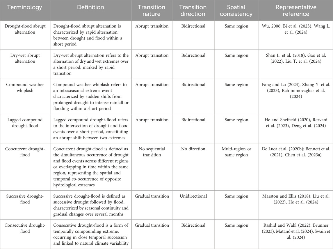 As shown in Figure 1, temporally compound drought-flood events can be categorized into four types: consecutive drought-flood events, successive drought-flood events, concurrent drought-flood events, and DFAA events (Marston and Ellis, 2018; He and Sheffield, 2020). It is evident that the terminologies of DFAA, dry-wet abrupt alternation, compound weather whiplash, and lagged compound drought-flood events describe similar phenomena, all with the features of abrupt transition, bidirectionality, and the same region from Table 1. In contrast, concurrent drought-flood events do not involve sequential or directional transitions and lack spatial consistency. Successive and consecutive drought-flood events both emphasize gradual transitions in the same region, whereas successive events are a one-way transition from drought to flood without reversal. Successive and consecutive drought-flood events reflect gradual transitions over several weeks or months, typically caused by seasonal or natural variability (Brunner, 2023; Matanó et al., 2024), whereas DFAA events are characterized by abrupt transitions between drought and flood states within days to weeks. DFAA events are often triggered by short-term atmospheric circulation anomalies (Madrigal et al., 2024; Wang H. et al., 2024; Yu et al., 2024).
