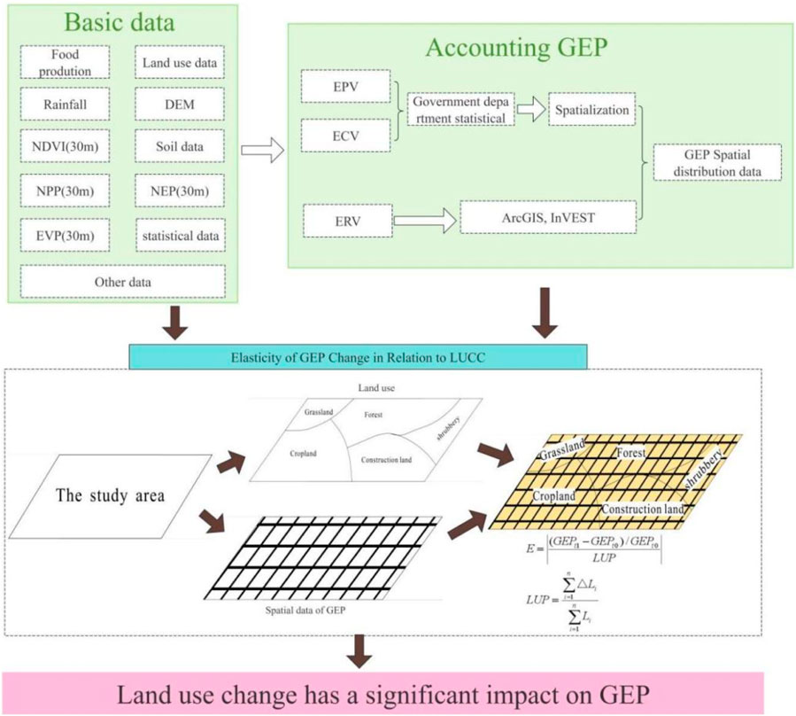 The GEP were calculated in 2005, 2010, 2015, and 2020 in the basin of the upper Yangtze River and Pearl River with intersecting water systems. Furthermore, we analyzed the spatiotemporal evolution characteristics of the GEP in the basin between 2000 and 2020. In addition, an elasticity index model was applied to identify the effects of the spatiotemporal variations in the land use changes on the GEP. The research framework is shown in Figure 1.