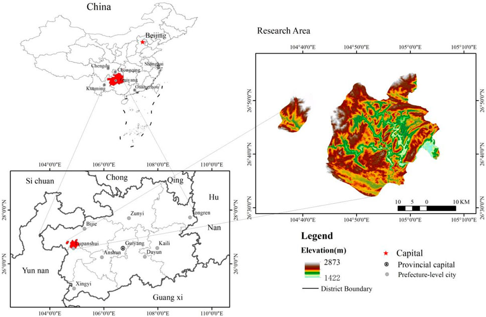 The Zhongshan District of Liupanshui City in Guizhou Province is in the transition zone between the East Yunnan Plateau and the Central Guizhou Plateau, as well as between the Northwest Guizhou Plateau. Its topography is characterized by significant features. The terrain is generally high in the northwest and low in the northeast. The highest peak, Jiucaiping, is located in Dawan Township and has an altitude of 2,900.3 m, while the lowest point is located at the exit of Jiehe, Dushan Village, Yuezhao Township, at an altitude of 1,450 m, forming a tiered sloping zone. The mountain ranges in the area have a profound influence on the natural environment and are mainly composed of three branches of the Wumeng Mountains. One mountain range, which extends southeastward from Meihuashan through Dewu and Fenghuang, is the basin between the Shucheng River (Xiangshui River) in the Yangtze River water system and the Beipanjiang River in the Pearl River water system. The second mountain range extends southward from Meihuashan to Shuangga Township through Dewu, Huangtupo, and Hecheng, dividing the Shucheng River and the Sanchuan River (the Dahe section). The third mountain range starts from Jiucaiping and extends eastward to Yide in Dahe Township, becoming the basin of Sancha River and Lianshan River, with a total area of 10,343 km2 and a total population of 790,800 people. The average annual temperature is 12.9 °C, and the annual precipitation is 1,158 mm. The main ecosystem types are forests, wetlands, meadows, farmlands, and cities, and the vegetation cover is 76.8% (Figure 2).