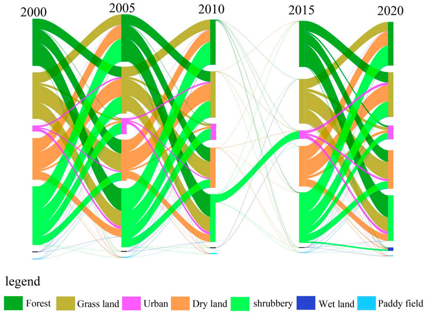 The transfers between the land use types in the area between 2000 and 2020 mainly involved interchanges between urban land, shrubland, and dryland. The growth of the urban land far outpaced the rate of its transfer, exhibiting an increasing trend from year to year (Figure 3). The expansion of the urban land mainly encroached on areas previously occupied by shrubland, dryland, and grassland, with 86.5%, 11.56%, and 12.1% of the newly developed area being converted from shrubland, dryland, and grassland, respectively. The increase in the area of the wetland was mainly through conversion of shrubland, dryland, and grassland, but the increase was not significant. The shrinkage of the shrubland was mainly attributed to conversion to urban land, grassland, forest, dryland, and water sources. The shrinkage of the dryland was mainly attributed to conversion to grassland, forest, and urban land. The decline in the forest area was mainly attributed to conversion to dryland, grassland, and shrubland. It should be noted that the land use change in the study area during 2010–2015 was relatively small, and the main type of conversion was the conversion of shrubland to built-up land. This conversion accounted for 3.11% of the shrubland in 2020.