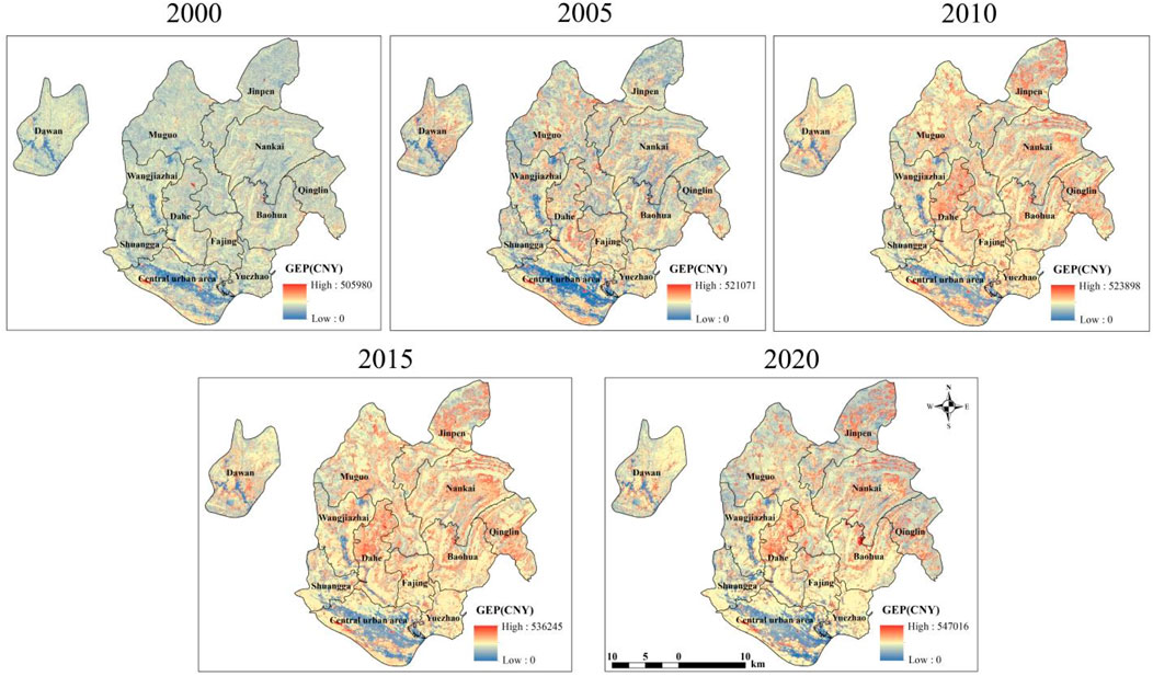 Methods: Through systematic analysis of the land use changes between 2000 and 2020, calculated the GEP for 2000, 2005, 2010, 2015, and 2020. In addition, based on the elasticity index, the impact of land use change on the spatial differentiation of the GEP was further clarified at the raster scale.