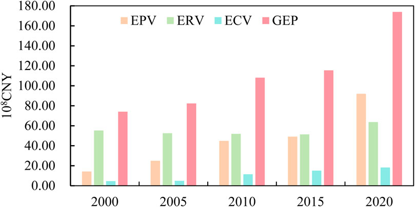 GEP refers to the sum of the values of the final goods and services provided by ecosystems to human beings within a certain time frame in a certain region (Ouyang et al., 2020). It involves not only ecological value but also economic and social considerations. By transforming ecological benefits into economic gains, it helps to balance economic growth, environmental protection, and social wellbeing (Ouyang et al., 2013; Lin et al., 2022). As the Chinese government has put forward the concept of “green water and green mountains are golden mountains and silver mountains,” GEP accounting has become an important means of quantifying the value of “green water and green mountains are golden mountains and silver mountains” and of promoting sustainable development. In addition, it has become a concrete measure to realize the concept of “green water and green mountains are golden mountains and silver mountains.” The GEP includes the ecosystem provisioning services value (EPV), ecosystem regulating services value (ERV), and ecosystem cultural services value (ECV) (Ouyang et al., 2020). The functions and conditions of ecosystems are measured and evaluated by calculating the gross value of natural ecosystems such as grasslands, deserts, forests, and wetlands, as well as artificial ecosystems such as farmlands, pastures, and aquaculture farms (European Commission, Organisation for Economic Cooperation and Development, United Nations, World Bank, 2013). Compared with the results of most studies in China and abroad, which only give the economic value of a certain type of natural resources, the GEP includes the sum of the value of the products and services provided by ecosystems for human wellbeing and sustainable economic and social development, which is more complete and more adequate in reflecting the functioning and conditions of ecosystems. It is therefore easier to arouse the attention of the whole of society to ecological environmental protection. In addition, Ouyang et al. (2013) pointed out that GEP accounting can be used to reveal the contribution of ecosystems to economic and social development and human wellbeing, analyze the ecological linkages between regions, and assess the effectiveness and benefits of ecological protection. The current GEP accounting guidelines issued by the Chinese government and some local governments specify the indicator system and methodology of GEP accounting such that the value of provisioning services relies on the output and unit price of products such as agriculture, forestry, livestock, and fishery products (Zhang et al., 2022), the value of cultural services uses the number of tourists at tourist attractions and the cost of tourism for accounting; and the value of regulating services uses the amount of ecosystem service functions combined with the amount of substitution value for accounting.