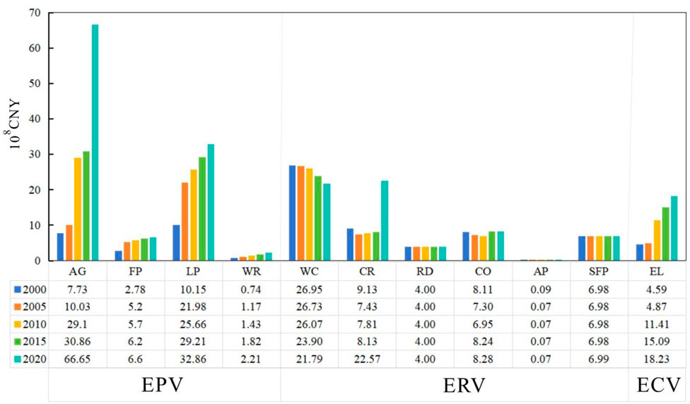 where EPV is the value of the ecosystem material goods, ERV is the value of the ecosystem regulating services, and ECV is the value of the ecosystem cultural services.