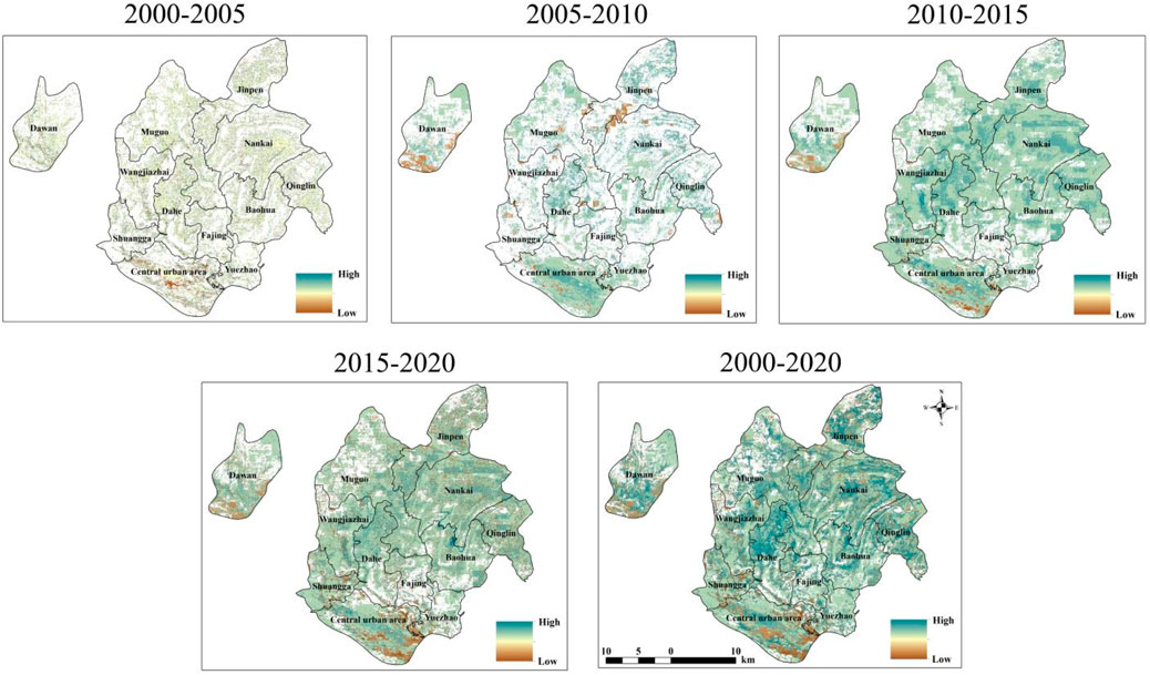 From 2000 to 2020, the spatial distribution of GEP changes in the study area exhibited significant variation. During the period of 2000–2005, areas with declining GEP were predominantly located around the central urban area, whereas regions with increasing GEP were more evenly distributed. From 2005 to 2010, GEP reductions were mainly observed in the southern parts of Dawan Town and Jinpen Township, while increases were primarily concentrated in the central urban area and Dahe town. Between 2010 and 2015, the decline in GEP was mainly found in the southeast of the central urban area, while growth areas remained relatively evenly distributed. A similar spatial pattern persisted from 2015 to 2020. Over the past 2 decades, the overall spatial pattern of GEP changes indicates that the southeastern part of the central urban area and the southern part of Dayuan town experienced concentrated declines, whereas the northeastern regions of Dahe, Jinpen, Nankai, and Qinglin Township were characterized by concentrated increases (Figure 7).