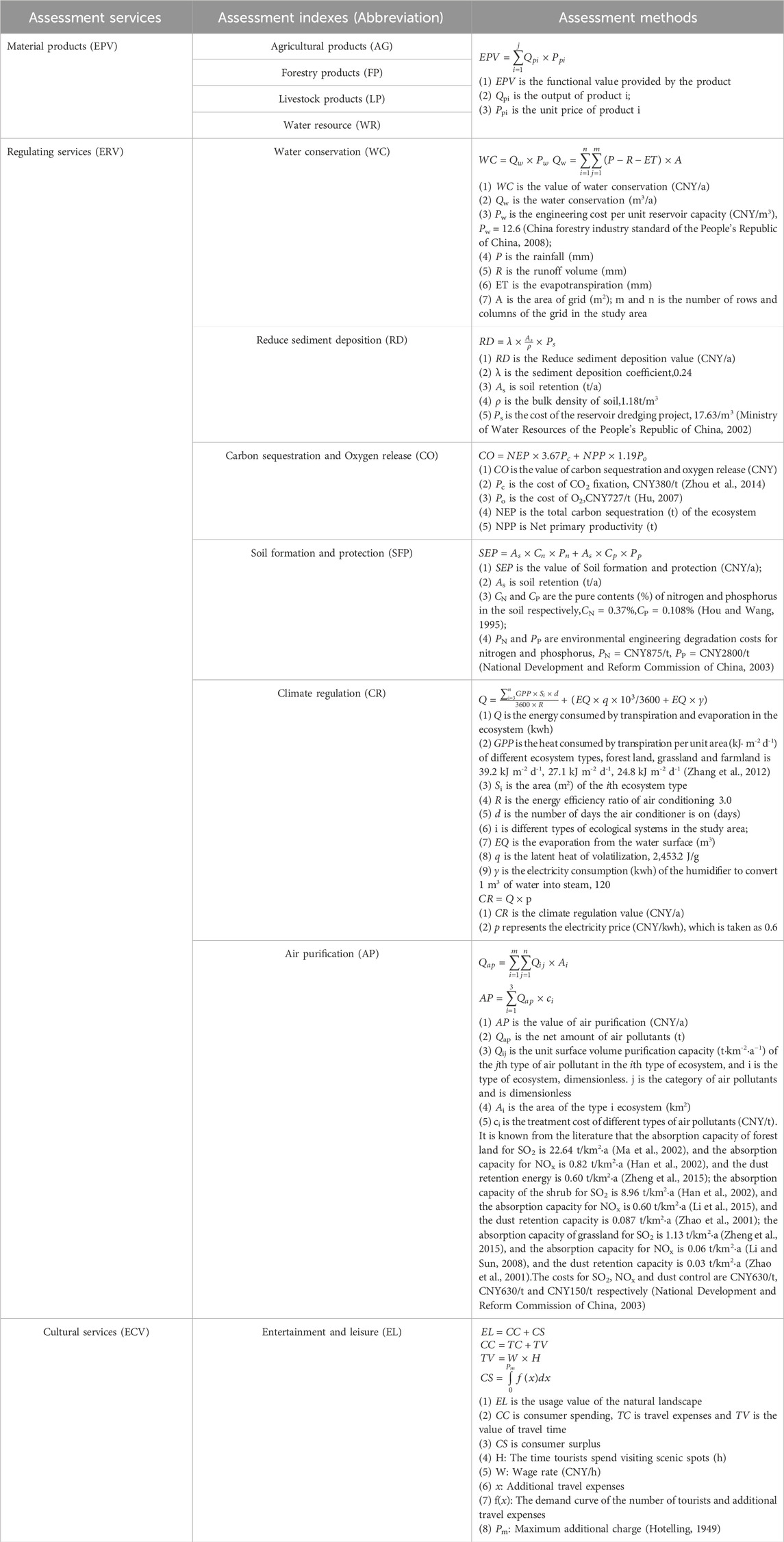 The GEP accounting covers the values of the material goods, regulating services, and cultural services provided by the ecosystems, but it excludes the value of the supporting services (Wang et al., 2022). It is calculated using the following formula Equation 3: