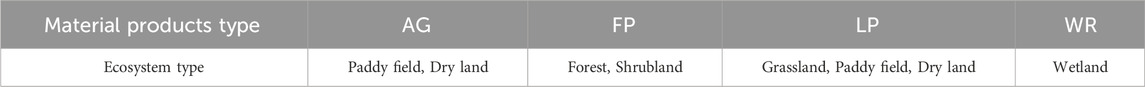 In this study, a comprehensive accounting framework for the GEP was constructed. The framework considers the importance of the GEP and systematically examines the characteristics of each type of ecosystem in the basin. The system consists of 11 functional indicators, which are categorized into three main types of services and products: material goods, regulating services, and cultural services (see Table 2).