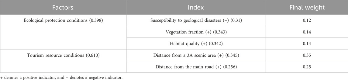 The tourism suitability index is corrected as the amount of recreational and leisure value at the raster scale for each ecosystem type. The process of calculating the tourism suitability index is as follows: ① Construct the tourism suitability evaluation index system. The research choose the vegetation coverage, habitat quality, susceptibility to geologic hazards, the distance from the 3A scenic spot, and the distance from the main road. ② Set the weights of each index, which is determined by referring to the research of Guan et al. (2023) and with the aid of expert scoring (Table 4).