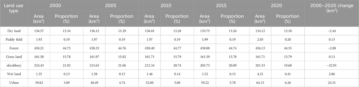 The land use structure in the study area remained relatively stable between 2000 and 2020. The hierarchical order of the area proportions of the land use types did not change significantly during this period. Forests accounted for the largest proportion, followed by grassland and shrubland; while urban land, wetlands, and paddy fields accounted for smaller proportions (Table 5).