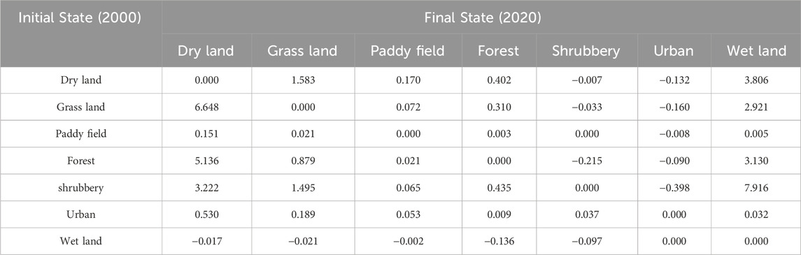 By constructing and analyzing the land use type transfer matrix (Hou et al., 2022), the structural characteristics of the land use in the basin and the dynamic change trend of each category were systematically revealed. The calculation formula is as follows Equation 1: