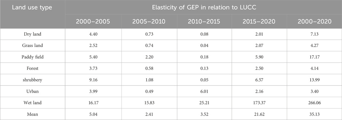 3. In 2000–2020, the land use changes that made the greatest contributions to the GEP growth were the increase in the wetland area and the conversion of forest, grassland, and shrubland to cropland. Quantitative analysis of the elasticity coefficient revealed that small changes in the wetlands and cropland may lead to significant changes in the GEP.