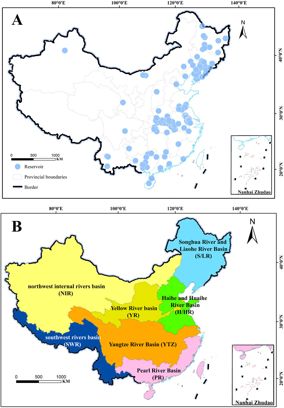 Figure 1. Reservoir distributions (A) and river basin divisions (B). All reservoirs are categorized into seven major basins, including the Songhua River and Liaohe River (S/LR) basin, the Haihe and Huaihe River (H/HR) basin, the Yellow River (YR) basin, the Yangtze River (YTZ) basin, the Pearl River (PR) basin, the southwest rivers (SWR) basin and the northwest internal rivers (NIR) basin (Zhou et al., 2024). The Pearl River Basin includes the watersheds of the Southeast Rivers.