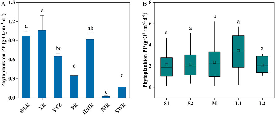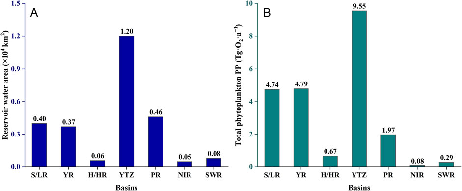 Figure 7. Estimation of total phytoplankton PP in different basins. (A) shows reservoir area, and (B) displays PP estimates.