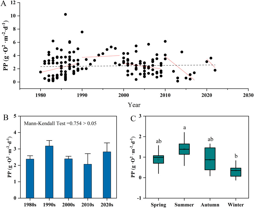 Figure 4. Temporal distribution characteristics of phytoplankton PP in reservoirs across China. (A) displays the distribution of PP data (1980–2023), with red and black trend lines representing decadal and full-period trends, respectively. (B) compares PP across time periods (mean ± SD; Mann-Kendall test). (C) shows seasonal variations in PP. Different small letters indicate significant differences at P < 0.05.