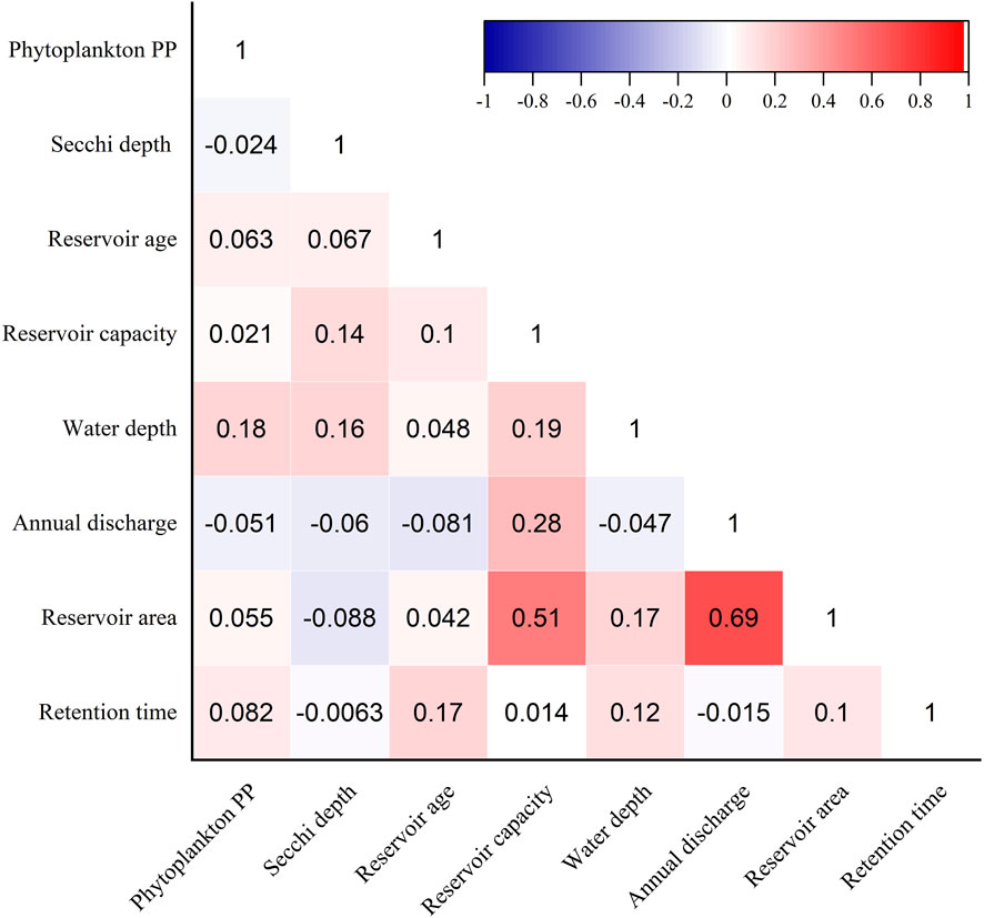 On the national scale, phytoplankton PP showed a weakly positive correlation with reservoir characteristics (Figure 5). None of the reservoir characteristics analyzed (including Secchi depth, total storage capacity, annual discharge, reservoir area, reservoir age, and retention time) were significantly correlated with phytoplankton PP (P > 0.05). Water depth was the only exception with a significant positive correlation with phytoplankton PP (R = 0.17, P < 0.05).