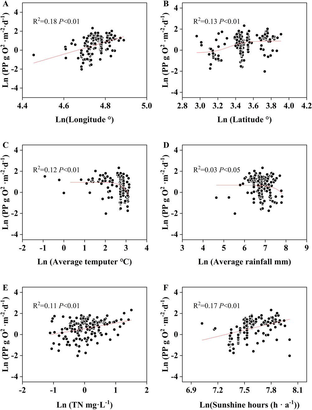 Figure 6. Correlation between phytoplankton PP and longitude (A), latitude (B), local annual average temperature (C), annual rainfall (D), TN (E) and sunshine hour (F) around the sample sites.