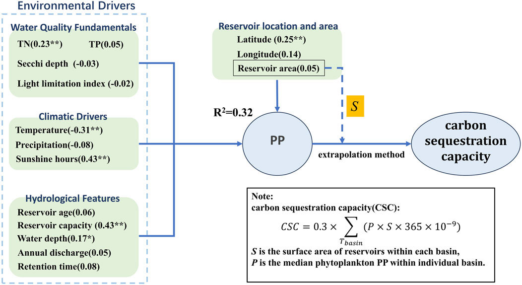 Figure 8. Conceptual framework linking drivers, phytoplankton PP and carbon sequestration. *P < 0.05; **P < 0.01.