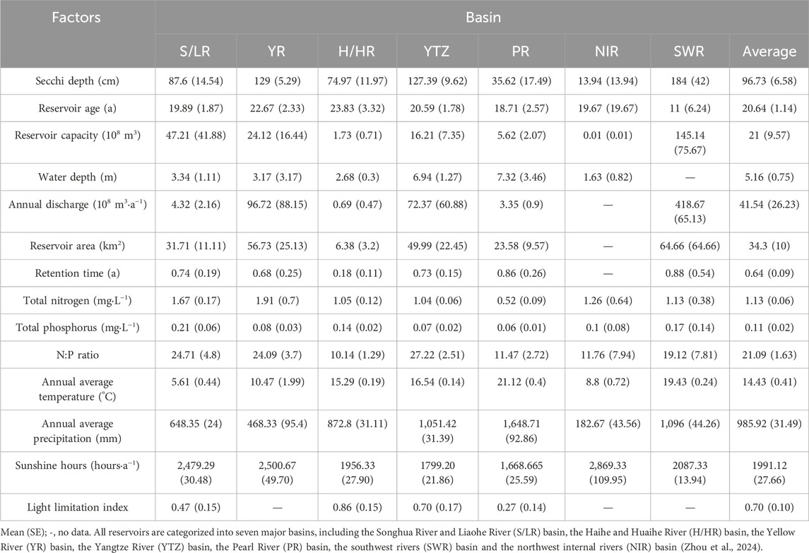 An exhaustive search and examination of all literature on phytoplankton PP in Chinese reservoirs from 1980 to 2023 was conducted using the China Knowledge Network Database and Web of Science. Information such as phytoplankton PP, geographical coordinates (latitude and longitude), sunshine hours, Secchi depth (SD), reservoir age, storage capacity, mean water depth, reservoir area, annual average temperature, annual average rainfall, total nitrogen (TN), and total phosphorus (TP) was extracted. In addition, the nitrogen-to-phosphorus ratio, water retention time and light limitation index were calculated. A comprehensive database comprising 165 reservoirs was ultimately established (Table 1 and Supplementary Material S1). Reservoir distributions and river basin divisions are shown in Figure 1.