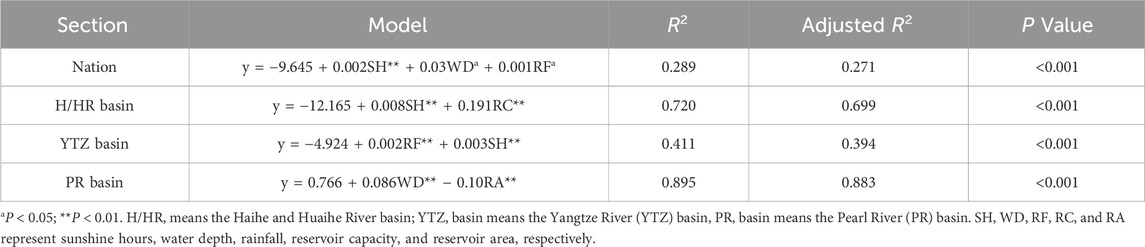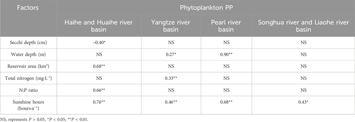 Sixteen variables were analyzed to identify key drivers of phytoplankton PP in Chinese reservoirs. Sunshine hours, water depth, and rainfall emerged as primary predictors, though the stepwise regression model explained 28.9% of PP variation (Table 3). Regionally, the Yellow River (YR) and Songhua River and Liaohe River (S/LR) basins showed non-significant regression results. Significant drivers included: Sunshine hours and Reservoir capacity (explaining 70.0% variation) in the Haihe and Huaihe River (H/HR) basin; Sunshine hours and average rainfall (41.1%) in the Yangtze (YTZ) basin; water depth and reservoir area (89.5%) in Pearl River (PR) basin.