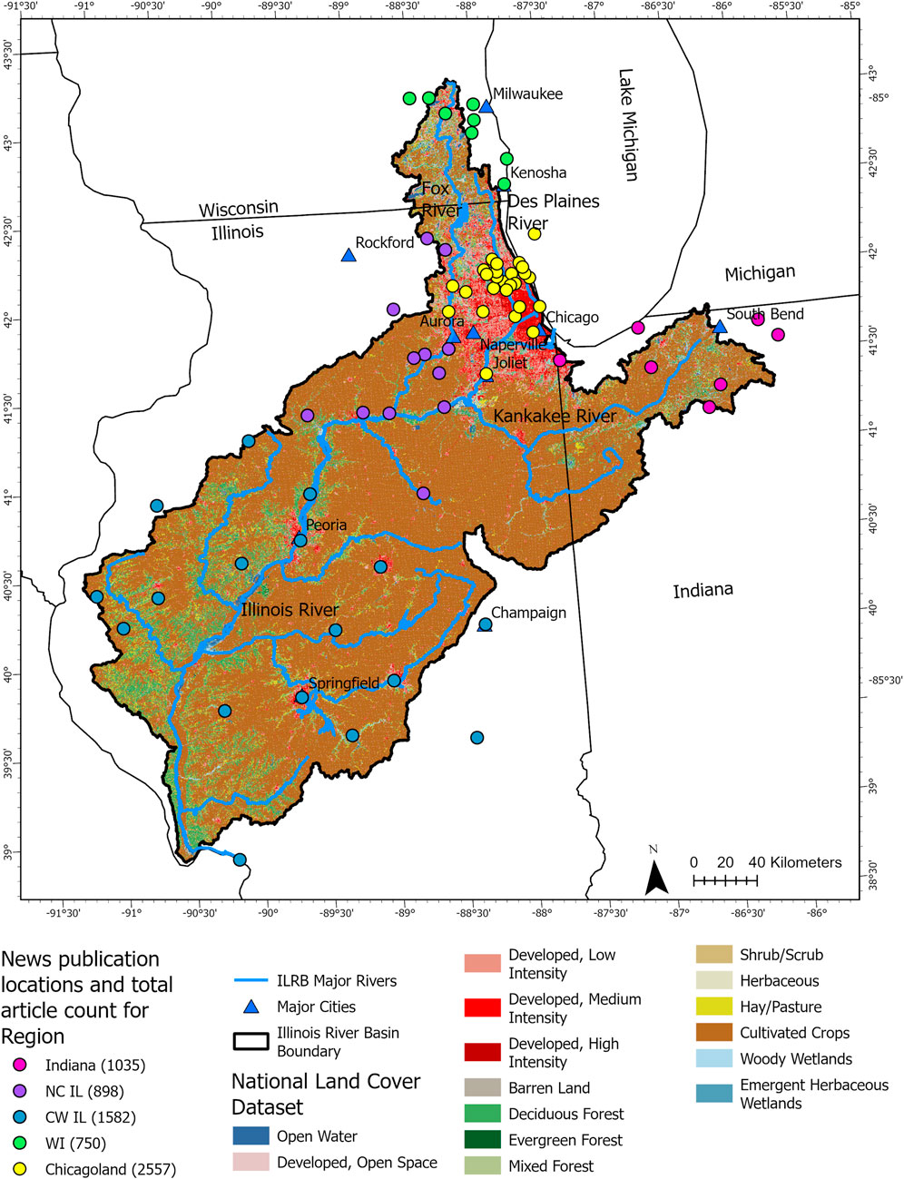 Figure 1. Newspaper publishing locations colored by assigned region with land cover (Dewitz, 2023), major rivers, and cities shown across the basin. Cumulative article count per region is displayed at the bottom of the figure. Regions include Indiana, North-Central Illinois (NC IL), Central-West Illinois (CW IL), Wisconsin (WI), and Chicagoland area.