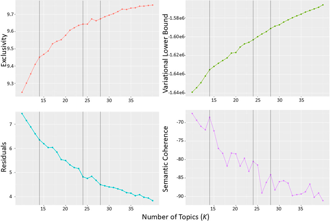 Figure 2. Model metrics including exclusivity, variational lower boundary, residuals, and semantic coherence (which are dimensionless values) were calculated for every solution between 10 and 40 topics. Bars identify candidate models that were considered for final model selection.