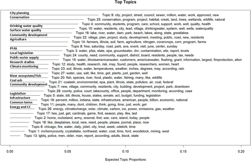 In contrast, the absence of some important water-quality topics was unexpected. Arsenic and nitrate and have previously been identified as the main water-quality concerns to groundwater in the ILRB (Kelly et al., 2018). While “nitrogen” is referenced as a keyword in the agriculture (T14-N) topic, arsenic is not seen in any of the top keywords across the 28 identified topics. Arsenic can be both a geogenically and anthropologically sourced contaminant, found at varying levels in drinking water across the state of Illinois (Kelly et al., 2018). Additionally, water-borne disease, bacteria, toxic algae blooms, have all been identified in previous media-analyses related to water in the U.S., and are absent from our 28 topics (Mayeda et al., 2019). Our results do not imply that these topics are not discussed at all within the dataset, but it does imply these missing topics are less prominent within local news than the 28 most salient topics displayed in Figure 3.