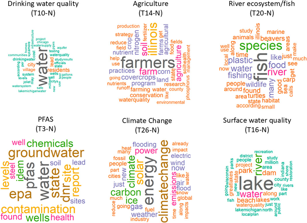 Six topics related to water quality were selected to more closely analyze, including drinking water quality (T10-N), agriculture (T14-N), PFAS (T3-N), energy and climate change (T26-N), river ecosystems/fish (T20-N), and surface water quality (T16-N). The top keywords associated with each of these topics are conveyed in word clouds in Figure 4. Word clouds for all 28 topics are provided in the Supplementary Material. Drinking water quality (T10-N) ranks 4th out of the 28 identified topics, and accounts for 6% of the corpus overall. Key words such as “study results”, “safe”, “levels”, “test”, in addition to place-based words such as “Lake Michigan water”, “aquifer”, and “wells”, all common drinking water sources for those in the ILRB, suggest that this topic relates to articles conveying the monitoring and safety of drinking water sources. “Lead” is the only specific water quality contaminant observed in the top 10 keywords for the drinking water quality topic (T10-N). This topic also contains additional, less frequent (i.e., below top 10), place-based words such as “Chicago”, “Joliet”, “Sycamore”, and “communities”. Agriculture (T14-N) is the seventh most prevalent topic, accounting for 5% of the corpus overall. Interestingly, the top keywords affiliated with this topic relate to harm reduction strategies, such as “conservation,” “practices,” “reduce,” “research,” “strategy,” and phrases including “soil health” and “cover crops.” While “nitrogen,” “nutrients,” “fertilizer,” “runoff,” and “phosphorus,” which relate to contaminants and contaminant sources/mechanisms do arise - this topic is overwhelmingly focused on best management practices and nutrient reduction, rather than the harmful effects of nitrate contamination. In fact, we do not see the word contamination or pollution appear in the top words associated with agriculture, nor do we see words such as cancer, or other health related negative societal impacts of agricultural contamination. PFAS ranks as the 9th most prevalent topic and covers about 4.5% of the corpus overall (T3-N), and includes words such as “pfas,” “contamination,” “groundwater,” “levels” and “wells,” indicating PFAS contamination in groundwater is of greater concern than surface water. Keywords referring to regulatory agencies such as “epa” (Environmental Protection Agency) and “dnr” (Department of Natural Resources) are also present in the keywords for PFAS (T3-N). Energy and climate change (T26-N), accounts for less than 3% of the corpus, and incorporates terms related to both climate change causes (“fossil,” “fuel,” “emissions”), impacts (“heat,” “flooding”) and renewable energy sources (“wind,” “electric,” “solar”). Notable other water-quality topics relate to river ecosystems/fish (T20-N) and coal ash (T21-N), each accounting for about 3% of the corpus. River ecosystems/fish (T20-N) includes references to various riverine “species” including “fish,” “turtles,” “carp,” “beavers” and “wildlife” more generally, in addition to “fishing,” and notably the keyword “plastic” appears.