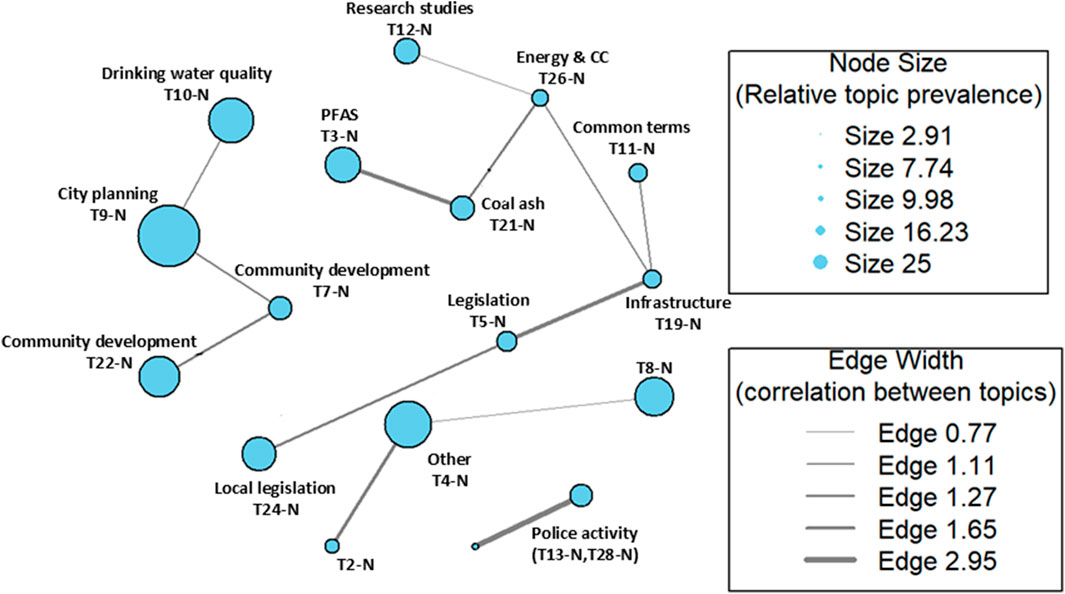 Figure 5 illustrates the correlations observed between topics in the news corpus, developed by adapting the topicCorr function in the STM package. Each node in the plot represents a topic, with the node’s size being proportional to the relative prevalence of the topic within the corpus. The weight of the edges linking nodes is relative to the correlation found between the topics. Topics without connectivity (or, without connectivity exceeding the chosen threshold) were removed from the figure. Energy and climate change (T26-N) is the topic most correlated to others, with correlations to research studies (T12-N), infrastructure (T19-N) and coal ash (T21-N), implying the interdisciplinary effects of climate change that are represented in the news. PFAS (T3-N) is correlated to coal ash (T21-N), and notably, not drinking water quality (T10-N). Drinking water quality (T10-N) is correlated with city planning (T9-N). Topics in the realm of infrastructure (T19-N) and legislation (T5-N, T24-N) are correlated, as well as community development (T7-N, T22-N) to city planning (T9-N).