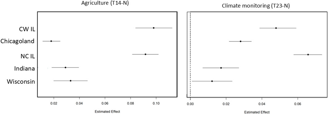 Figure 6. Point-range plots representing geographic variation in topic proportion for Agriculture (topic 14) and Climate monitoring (topic 23). The length of the line represents the 95% confidence interval of the point estimates.