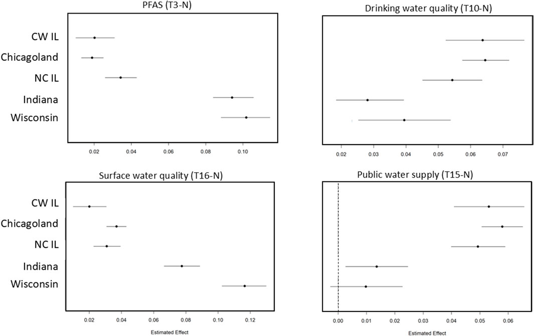 Four quadrant plots illustrate estimated effects across different regions for water-related topics. Top left shows PFAS effects, top right depicts drinking water quality, bottom left illustrates surface water quality, and bottom right shows public water supply. Regions include CW IL, Chicagoland, NC IL, Indiana, and Wisconsin. Horizontal lines represent confidence intervals with central points as estimates.