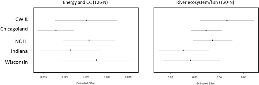 Two forest plots show estimated effects on the x-axis for five regions: CW IL, Chicagoland, NC IL, Indiana, and Wisconsin. The left plot is titled