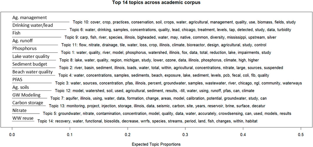 Figure 9. Top 14 topics representing the scientific abstract corpus defined by the most prevalent keywords within each topic. Abbreviations including Agriculture (Ag.), Groundwater (GW), and Wastewater (WW).