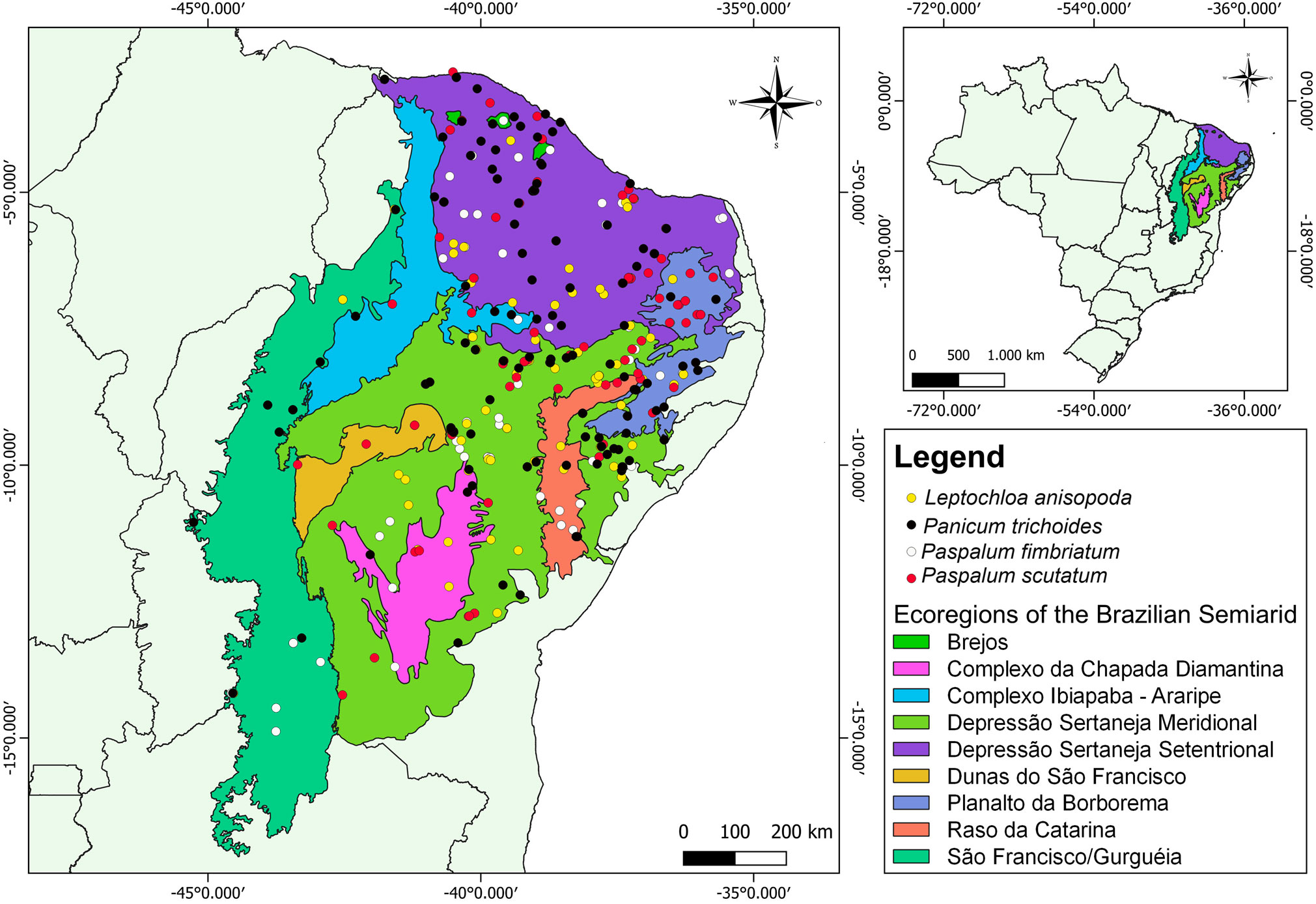 To test the hypotheses, we selected four annual grass species as biological models: Leptochloa anisopoda (B.L. Rob.) P.M.Peterson, Panicum trichoides Swart, Paspalum fimbriatum Kunth, and Paspalum scutatum Nees ex Trin. (Figure 2). These species were selected because 1) they are annual species; 2) they are widespread in the Brazilian semiarid (Figure 2); 3) their collections have a significant amount of samples; and 4) their collections start in the 19th century and fit the objective of testing variation through time. Leptochloa anisopoda and P fimbriatum are present in other semiarid regions of South America, but records show that their occurrence is predominant in the Brazilian semiarid (Maciel et al., 2009; Maciel and Valls, 2020). P. trichoides is widely distributed in North, Central, and South America (Andrade et al., 2007). P. scutatum is an endemic species from the Brazilian semiarid (Maciel et al., 2009).