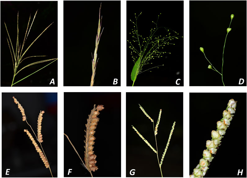 Figure 2. S pecies selected for the research. (A,B). Leptochloa anisopoda A: Inflorescence, B: spikelets (C,D). Panicum trichoides C: Inflorescence; D spikelets (E,F). Paspalum fimbriatum. E: Inflorescence; F: spikelets (G,H): Paspalum scutatum G: Inflorescence ; H: spikelets.