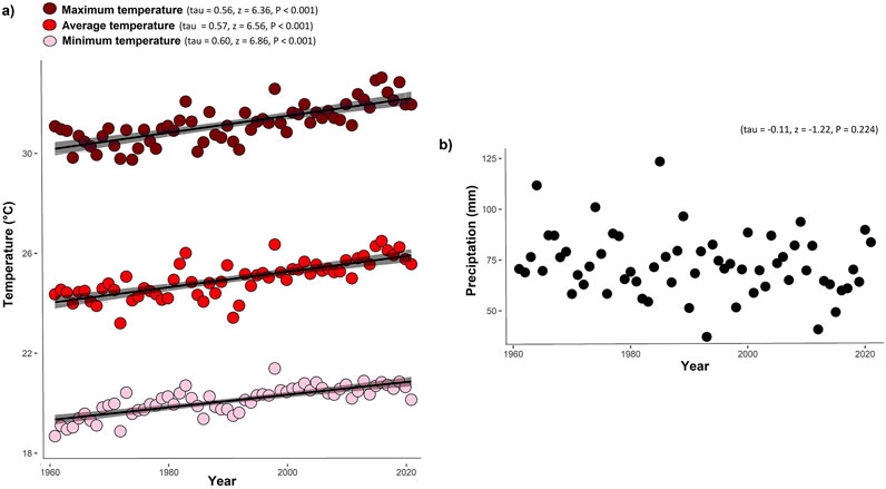 Temperatures increased significantly in the semiarid region of Brazil between 1960 and 2021 (Figure 3). The mean temperature increased by 1.89 °C (tau = 0.57, z = 6.56, P < 0.001), the minimum temperature was 1.54 °C higher (tau = 0.60, z = 6.86, P < 0.001), and the maximum temperature increased by 2.05 °C (tau = 0.56, z = 6.36, P < 0.001). Mean annual precipitation presented a trend to reduction, but without significance (tau = −0.11, z = −1.22, P = 0.2244042).