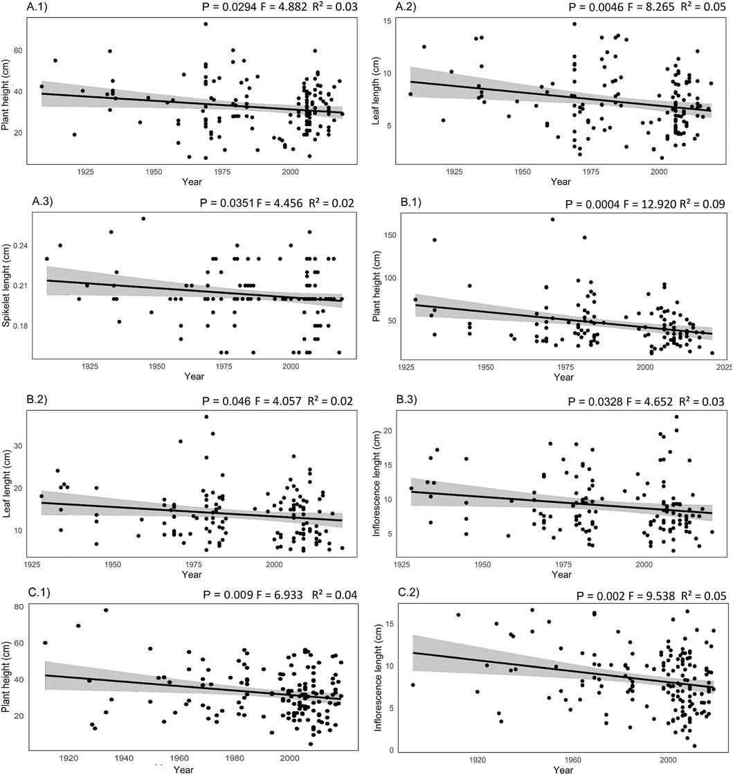 Figure 4. Linear regressions of morphological features versus year of collection (data from herbarium samples). (A) Paspalum scutatum: 1. Plant height, 2. leaf length, 3. spikelet length; (B) Paspalum fimbriatum: 1. plant height, 2. leaf length, 3. spikelet length; (C) Panicum trichoides: 1. plant height, 2. Inflorescence size.