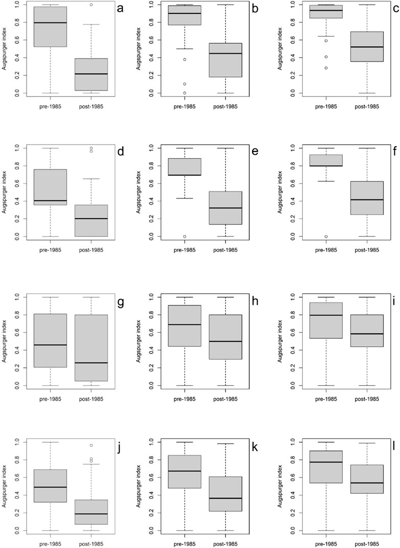 Despite the four species showing a trend to reducing phenological synchronicity between pre-1985 and post-1985 (Figure 5), significant reductions in all reproductive scenarios were found for L. anisopoda, P. fimbriatum and P. scutatum. In L. anisopoda 30-day scenarios presented higher reduction in Augspurger Index (0.67–0.26, χ2 = 72.889, df = 46, P = 0.007), followed by 60-day (0.77–0.41, χ2 = 82.747, df = 58, P = 0.018) and 90-day (0.85–0.51, χ2 = 92.596, df = 65, P = 0.014) scenarios. For P. scutatum, the same pattern was found (30-day: 0.51–0.27, χ2 = 91.602, df = 52, P = 0.006; 60-day: 0.62–0.43, χ2 = 92.993, df = 63, P = 0.008; 90-day: 0.69–0.56, χ2 = 106.44, df = 71, P = 0.004). For P. fimbriatum 60-day scenario had a higher change (0.77–0.41, χ2 = 82.747, df = 58, P = 0.018) than 90-day (0.85–0.51, χ2 = 92.596, df = 65, P = 0.014) and 30-day (0.53–0.37, χ2 = 89.853, df = 45, P < 0.001). Panicum trichoides show reduction in phenological synchronicity only for 90-day scenarios (0.77–0.43, χ2 = 103.55, df = 78, P = 0.028).