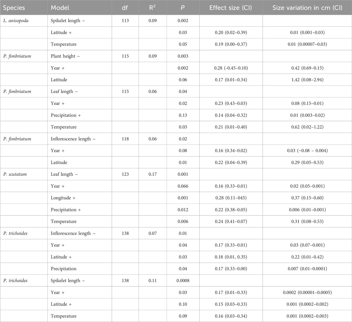Seven models explaining the morphological variation of all species were identified. The variable year consistently emerged in six models and was the most significant factor in four models, highlighting that temporal changes play a central role in the morphological variations (Table 1). We found a correlation among geographic and climatic drivers and variations in the morphological traits of the analyzed species. L atitude correlated positively with inflorescence length in P. trichoides and P. fimbriatum and with spikelet length in L. anisopoda, while longitude associated with increases in leaf length in P. scutatum (Table 1). Among the climatic variables, temperature had a positive effect on leaf length in P. fimbriatum and P. scutatum and on spikelet length in L. anisopoda (Table 1). Mean precipitation positively influenced leaf length in P. fimbriatum, but negatively affected leaf length in P. scutatum and inflorescence length in P. trichoides (Table 1). Plant height was the only trait explained solely by year in the multiple regressions, indicating changes over time (Table 1).