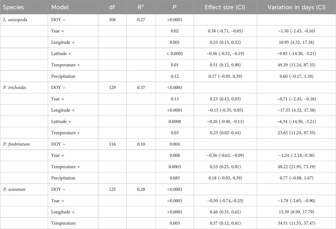 Unlike simple linear regression, in the multiple regressions the variable year exhibited a significant trend of accelerated reproductive period in L. anisopoda (1.30 days per year), P. fimbriatum (1.24 days per year), and P. scutatum (1.78 days per year). All multiple regressions retrieved the mean annual temperature as an informative variable, showing positive and significant relationship with phenological changes and indicating that higher temperatures tend to delay the reproductive time of grasses (Table 2). Latitude exhibited a negative relationship with reproductive time, suggesting that specimens located further north tend to flower and fructify earlier, as observed in L. anisopoda and P. trichoides (Table 2). Longitude showed a positive relationship with DOY in L. anisopoda and P. scutatum (specimens further east tend to flower later) and a negative relationship in P. trichoides (Table 2). Finally, mean annual precipitation did not show a significant relationship with the reproductive time of the analyzed species (Table 2).