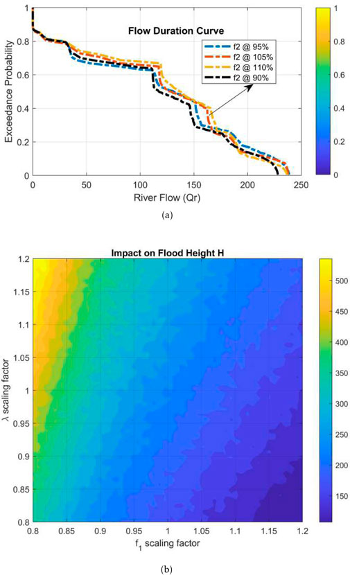 In Figure 8b, the heatmap indicates the sensitivity of flood height