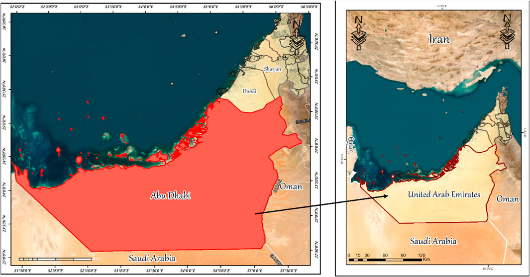 Abu Dhabi Emirate, the largest of the seven emirates in the United Arab Emirates, spans approximately 66,300 km2 accounting for nearly 87% of the country’s total land area. Situated within the hyper-arid zone of the Arabian Peninsula, it stretches between latitudes 22.5°–26.1° N and longitudes 51°–56.3° E. The region experiences an extremely arid climate, marked by scorching summer temperatures ranging from 40 °C to 50 °C during the day, mild winters, and minimal annual rainfall (typically less than 100 mm) (Wehbe et al., 2017).