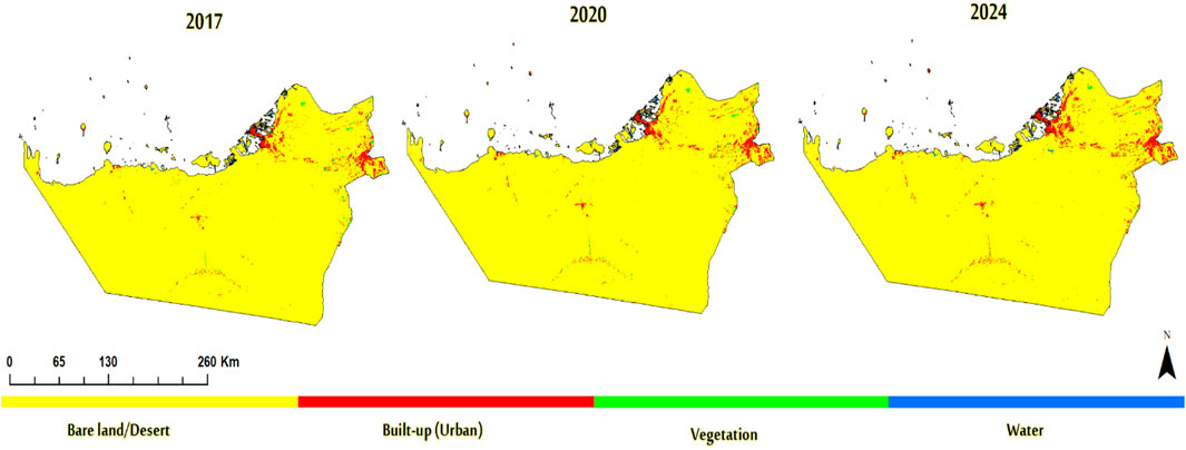 km2 (92.8%) of the emirate’s land area (Table 3). By 2024, this had slightly declined to 60,300 km2 (90.9%), signifying a gradual shift of barren land into alternative uses. The built-up urban footprint increased significantly during this period from about 2,000 km2 (3.0%) in 2017 to nearly 3,000 km2 (4.5%) in 2024. This reflects a 50% expansion in urban areas over 7 years, largely fueled by ongoing construction, housing developments, and industrial expansion. Vegetation also showed a positive trend, growing from roughly 2,200 km2 (3.3%) in 2017 to 2,700 km2 (4.1%) in 2024. This increase stems from agricultural growth in oasis regions and enhanced landscaping projects, such as park development, roadside greenery, and mangrove restoration (Aljaddani et al., 2022). Water bodies, including coastal waters and artificial ponds, declined slightly from 600 km2 (0.9%) in 2017 to 300 km2 (0.5%) in 2024. This reduction may be attributed to coastal reclamation and changes in man-made water retention areas. The total land area assessed was consistently around 66,300 km2 across all years, confirming the stability of mapping procedures.