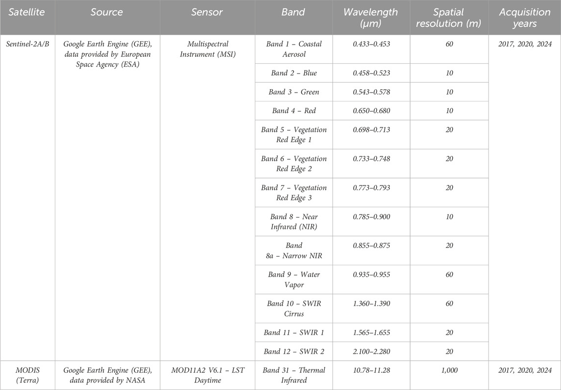Multi-temporal datasets were sourced from two primary satellite systems (outlined in Table 1): Sentinel-2 for optical land cover classification and MODIS Terra for thermal infrared measurements. All datasets were accessed and processed via Google Earth Engine (Gorelick et al., 2017). Operated by the European Space Agency (ESA), Sentinel-2A and 2B provide multispectral imagery at 10–20 m spatial resolution across visible, near-infrared (NIR), and shortwave infrared (SWIR) bands. Level-2A surface reflectance data, already atmospherically corrected using the Sen2Cor processor, were utilized for this study (Phiri et al., 2020). Cloud-free or minimally cloudy composite images from Sentinel-2 were selected for the years 2017, 2020, and 2024, focused around the summer months (June to August) to capture peak seasonal heating and vegetation growth. Within GEE, imagery was filtered by acquisition date and cloud coverage (using QA60 masks), and median composites were generated per year to minimize cloud interference. All relevant Sentinel-2 spectral bands were used, including visible bands (Blue, Green, Red at 10 m), NIR (10 m), SWIR (20 m), and red-edge bands (20 m), aiding in the differentiation of vegetation and built-up areas (see Table 1 for details). These composites were resampled to a unified 10 m resolution for classification purposes.